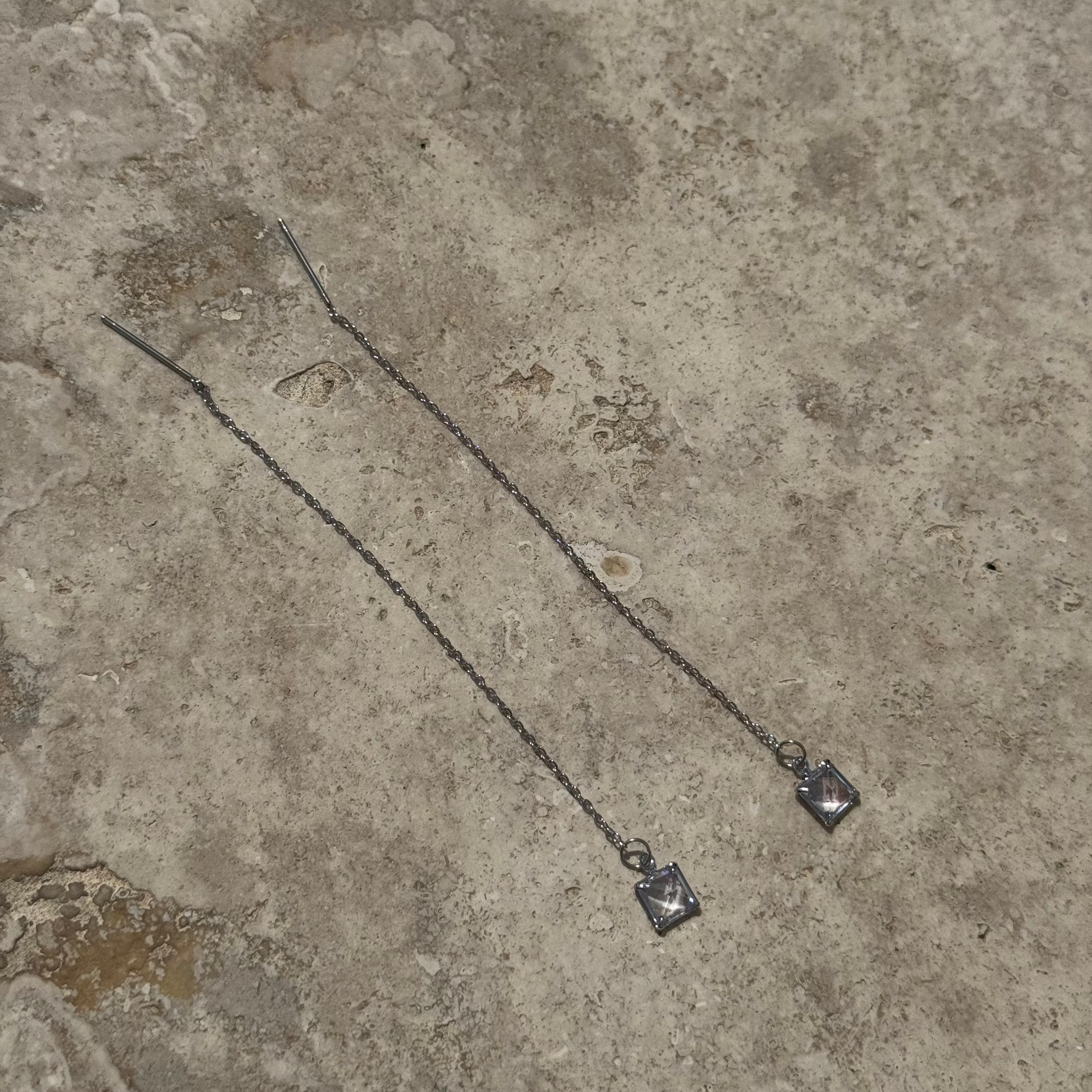 Suspendues à une chaîne argentée ultra-fine, elles se terminent par un petit carré délicat, orné d’un strass scintillant. Un jeu subtil entre géométrie et éclat, pour une allure à la fois moderne, sobre et lumineuse.