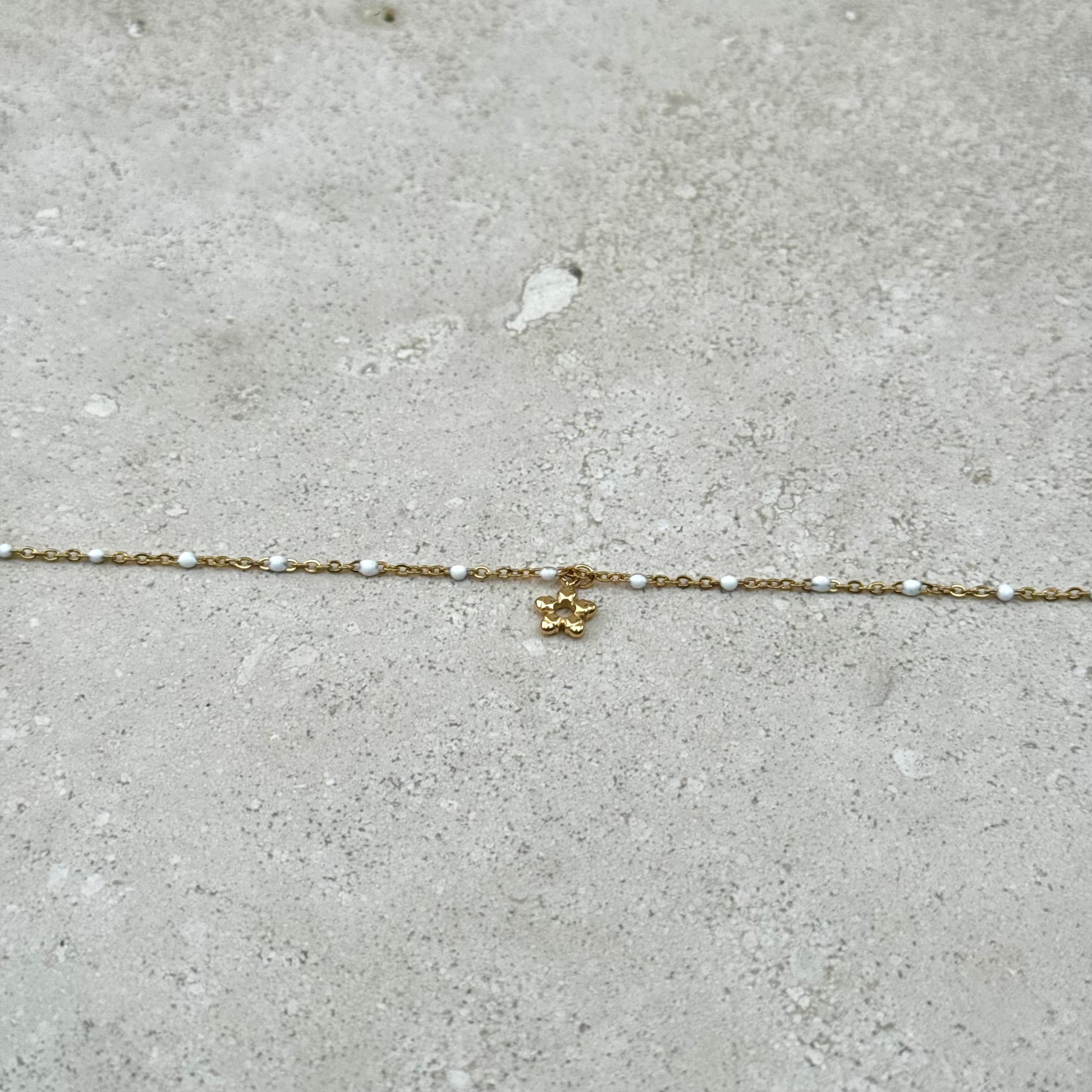 Sa chaîne dorée fine est agrémentée de boules blanches lumineuses, tandis que la pampille fleur apporte une note féminine et raffinée.