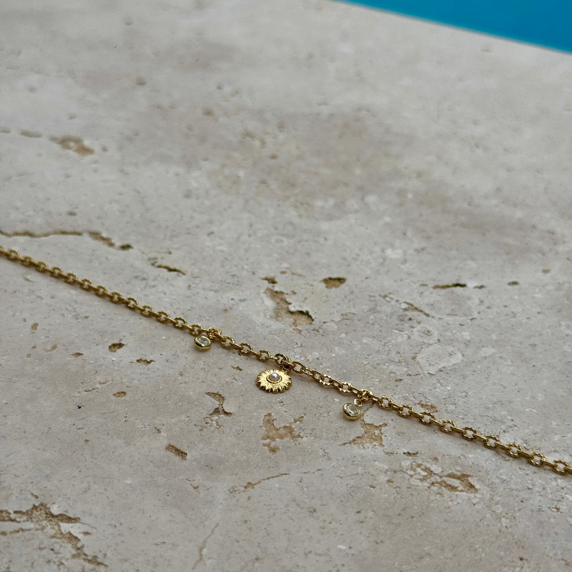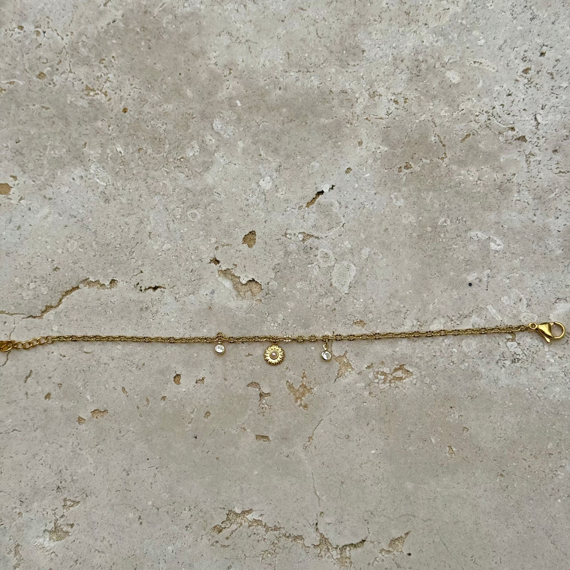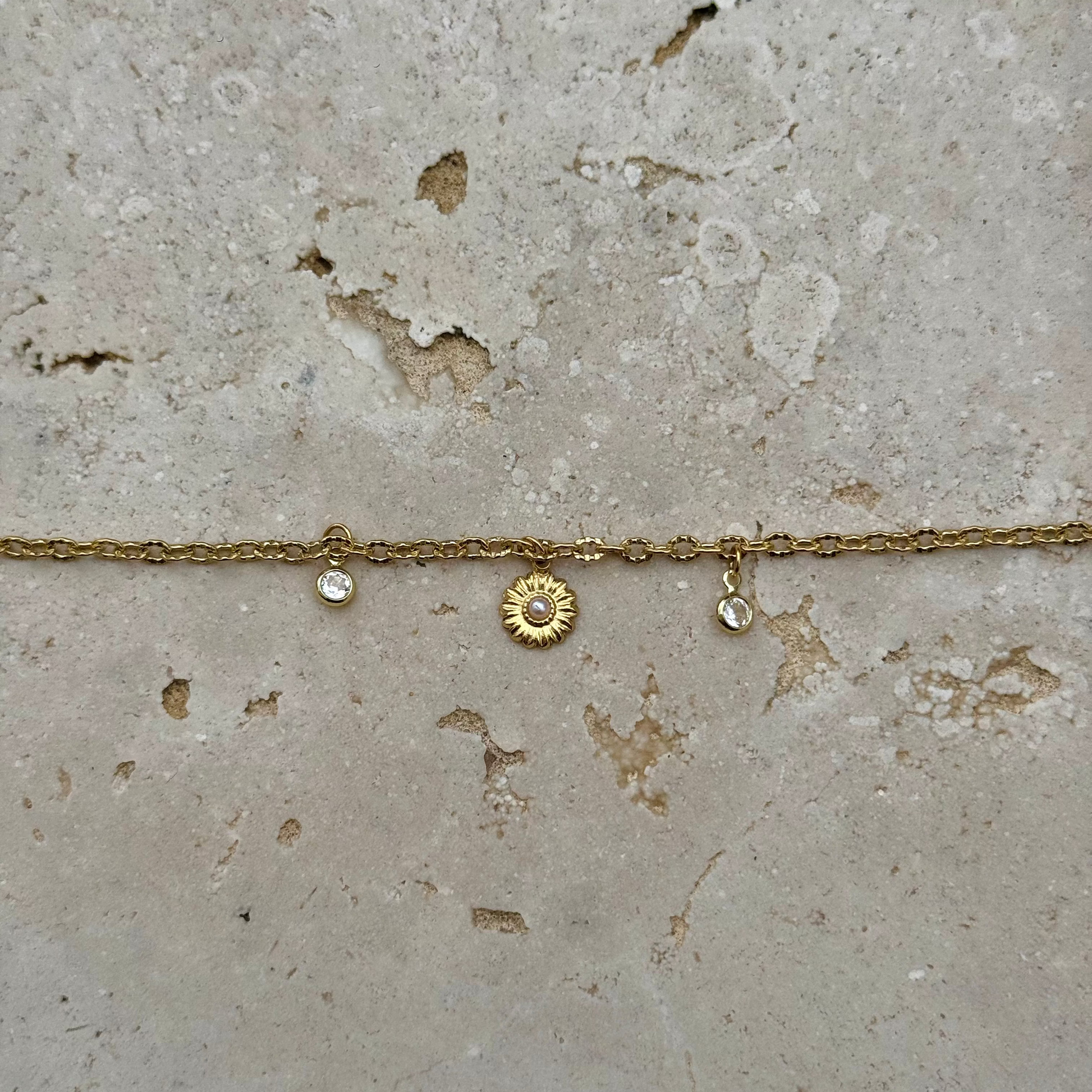 Le bracelet ✨Brillance Florale✨ mêle finesse et éclat avec sa chaîne dorée délicatement texturée d’un effet martelé. En son centre, une pampille en forme de fleur attire le regard, encadrée de chaque côté par un petit strass lumineux.
