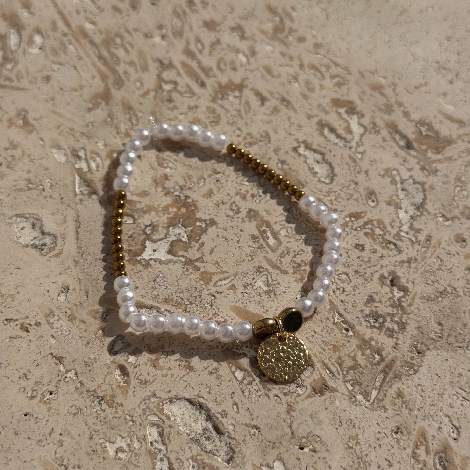 Bracelet élastique ✨Nacreia✨ en perles blanches, délicatement rehaussé de quelques perles dorées et d’une pampille ronde martelée en acier inoxydable.