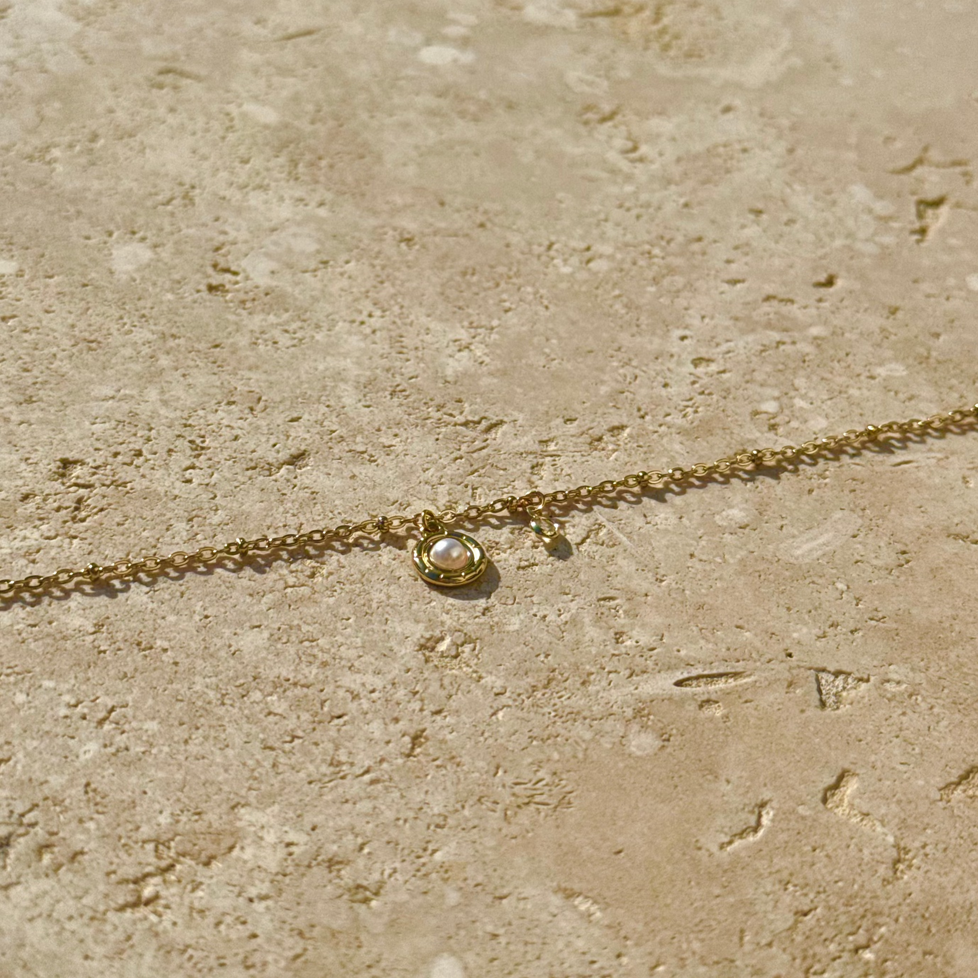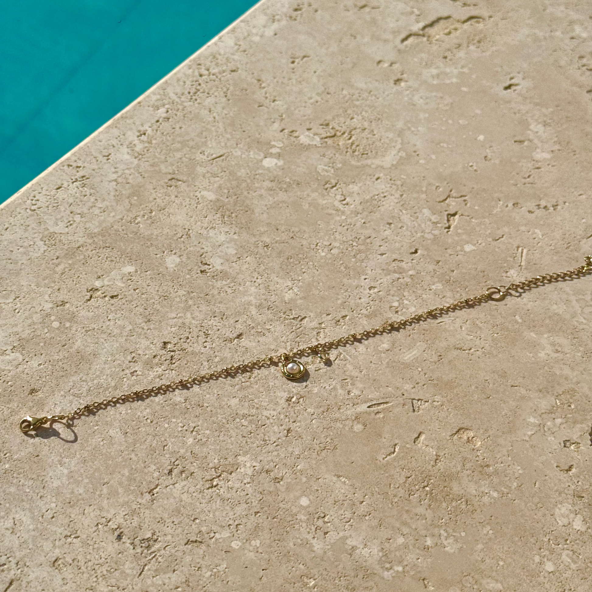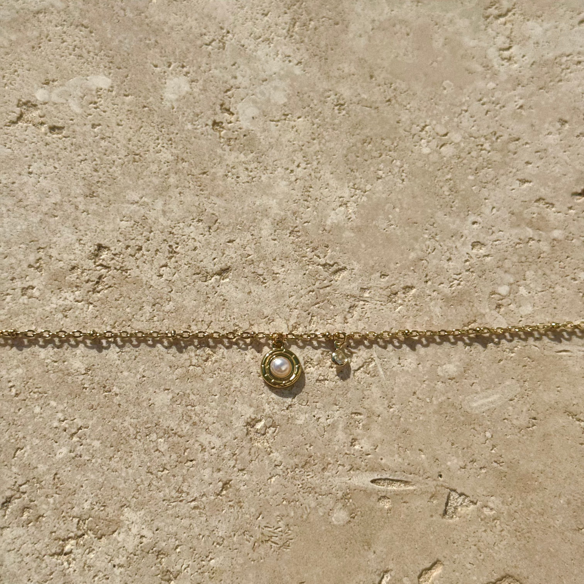 Délicat et raffiné, le bracelet ✨Perla✨ se compose d’une fine chaîne dorée ornée d’une pampille ronde au centre de laquelle brille une perle blanche, symbole de pureté et d’élégance. Un petit strass lumineux vient compléter ce design, apportant une touche d’éclat subtil.