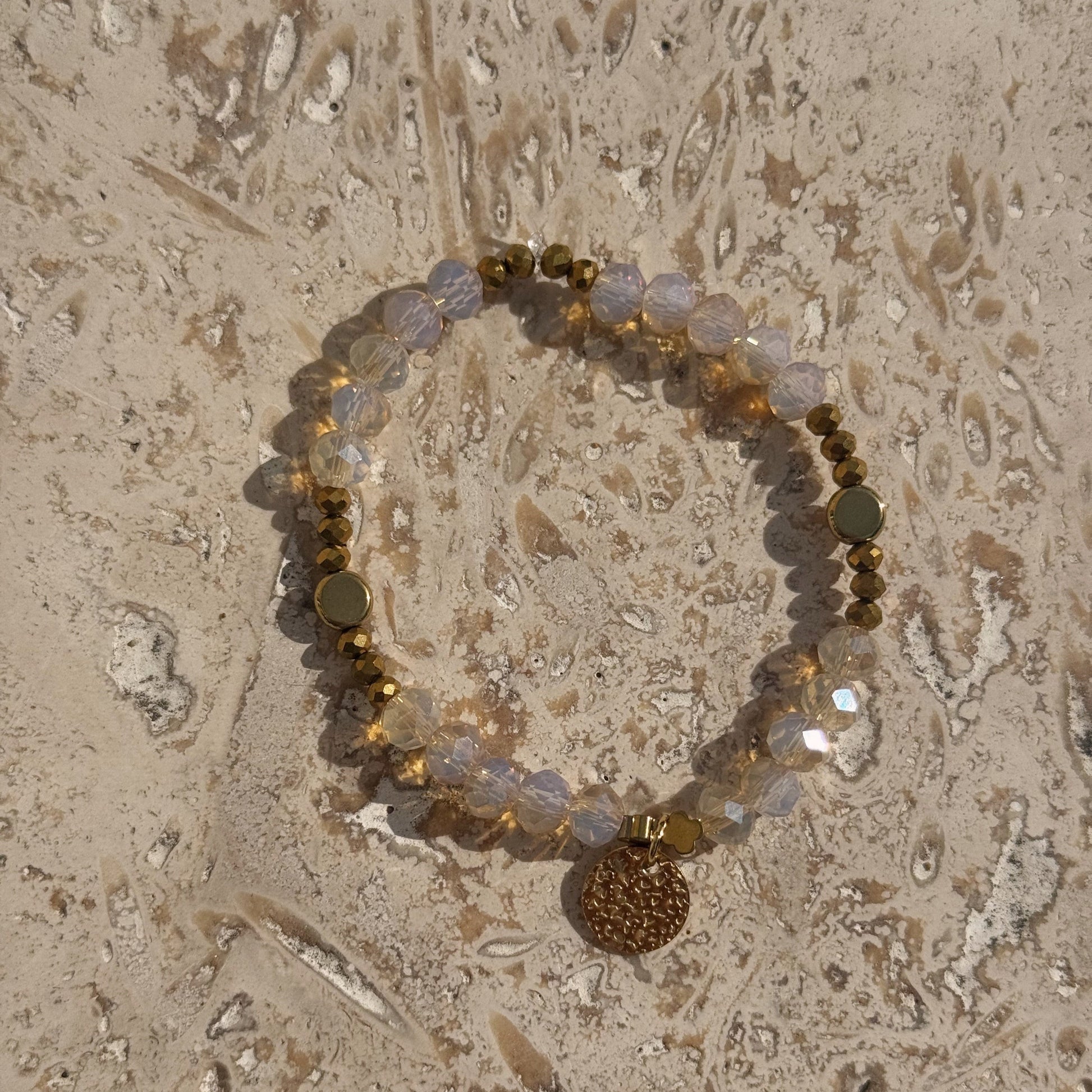 Bracelet élastique ✨Solara✨ en perles dorées transparentes et perles dorées pleines, illuminé en son centre par une pampille ronde martelée en acier inoxydable.