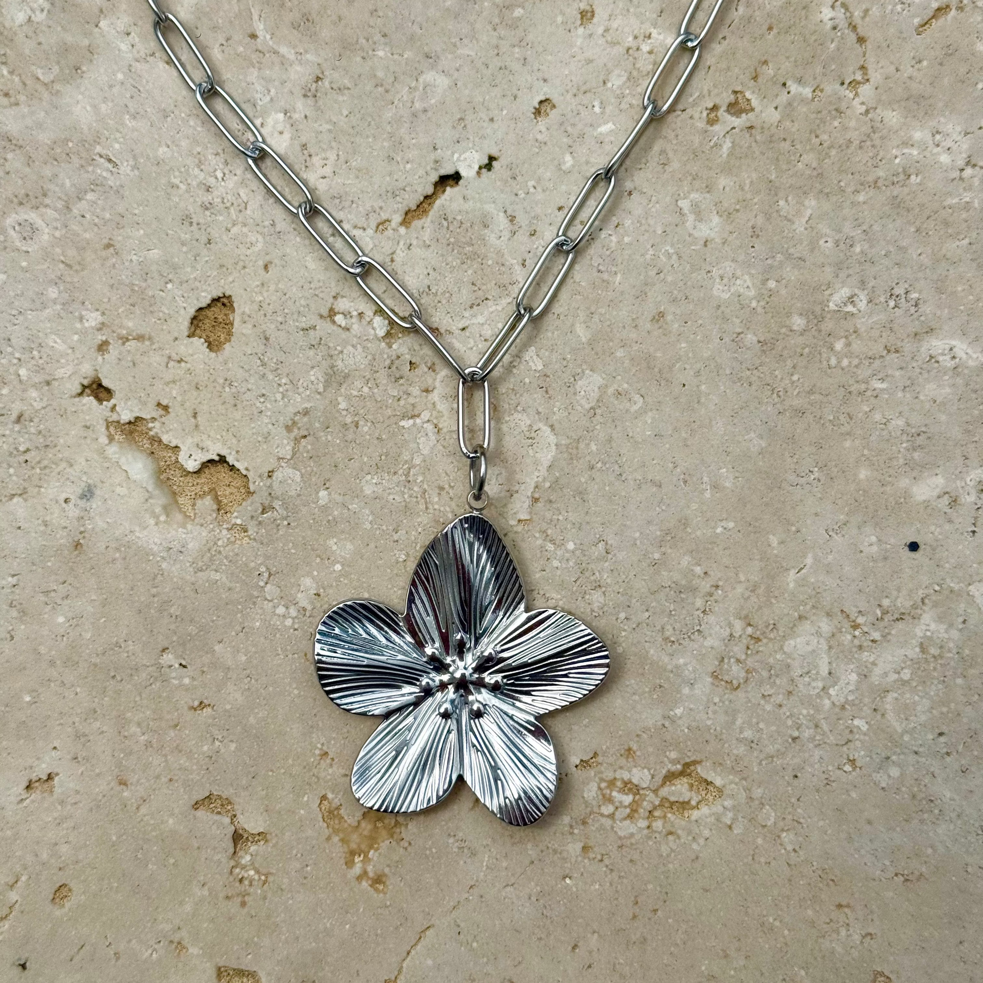 ✨Cœur de Fleur✨ est un collier qui mêle douceur et force avec équilibre. Sa chaîne épaisse argentée affirme le style, tandis que la fleur centrale apporte une touche délicate et féminine. Le contraste entre la structure robuste de la chaîne et la finesse du motif floral en fait un bijou original, facile à porter au quotidien ou pour habiller une tenue plus habillée.